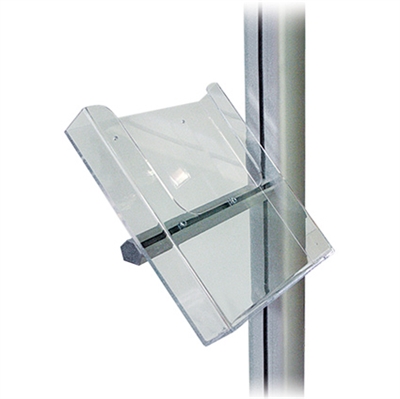 Skrå A4 brosjyreholder i krystallklar akryl med beslag for montering på ProStand displays.