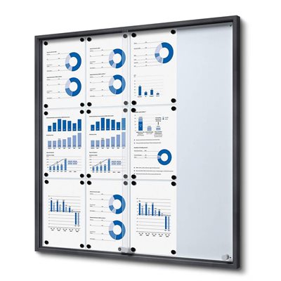 Skap laget av metall og aluminium, magnetisk skrivbar innvendig whiteboard tavle, med en dybde på 23 mm, slank antrasittgrå profilramme, skyvedører av 4 mm sikkerhetsglass med innebygd lås. 2 nøkler følger med. Kan brukes med whiteboard-tusjer og magneter.