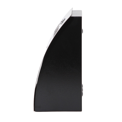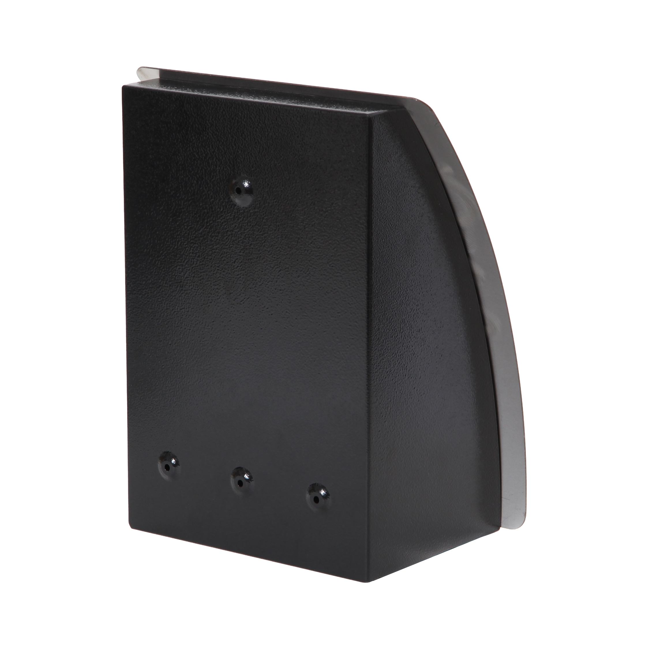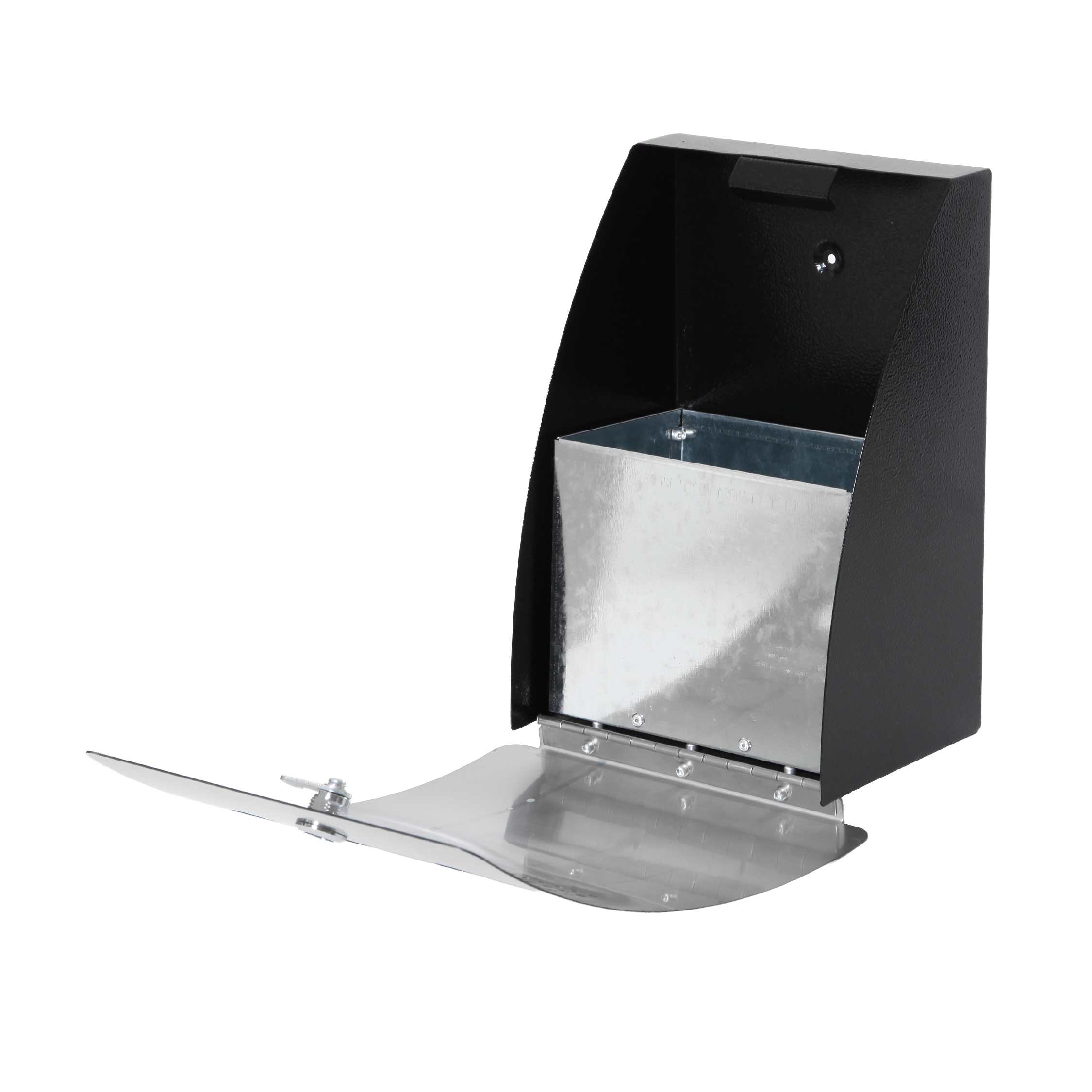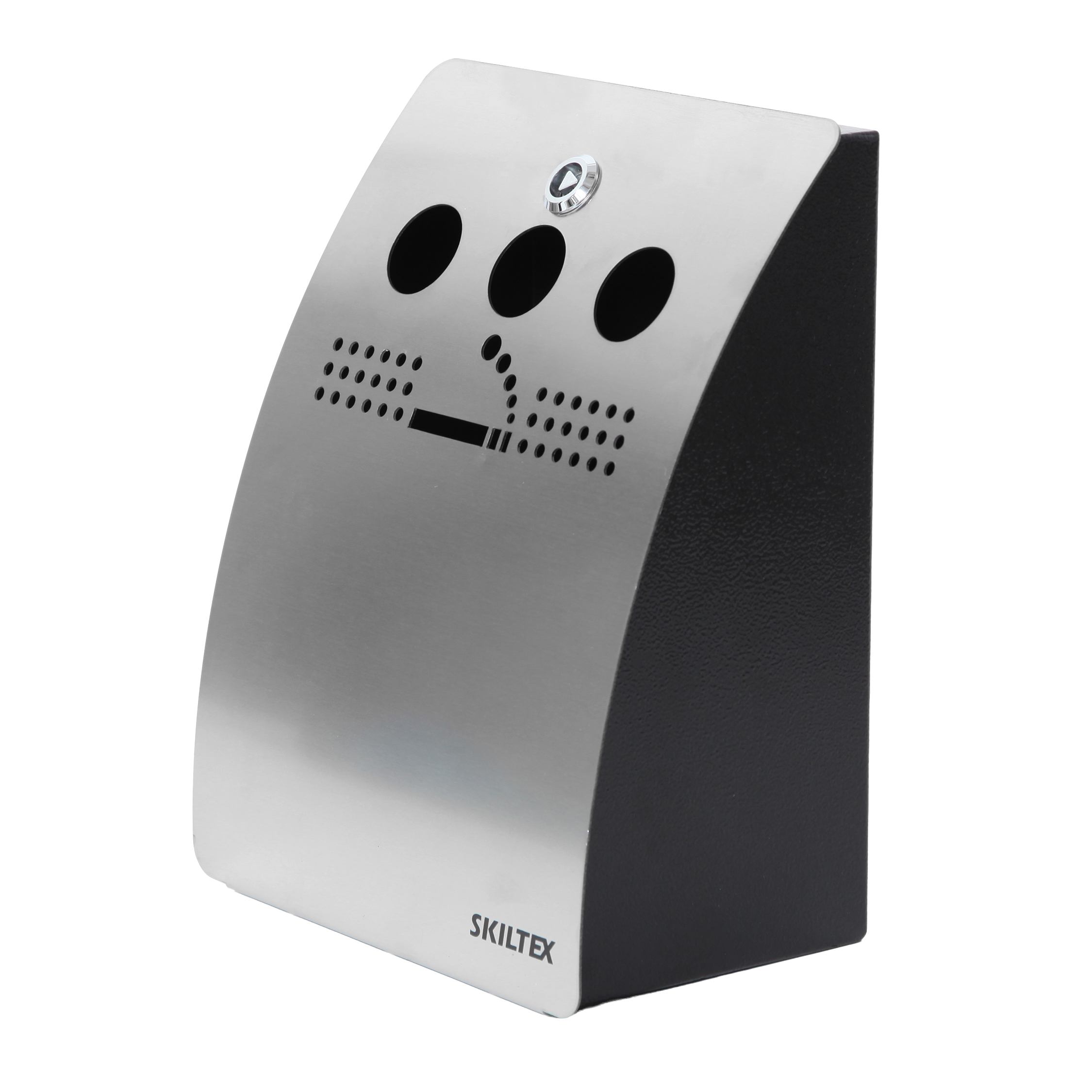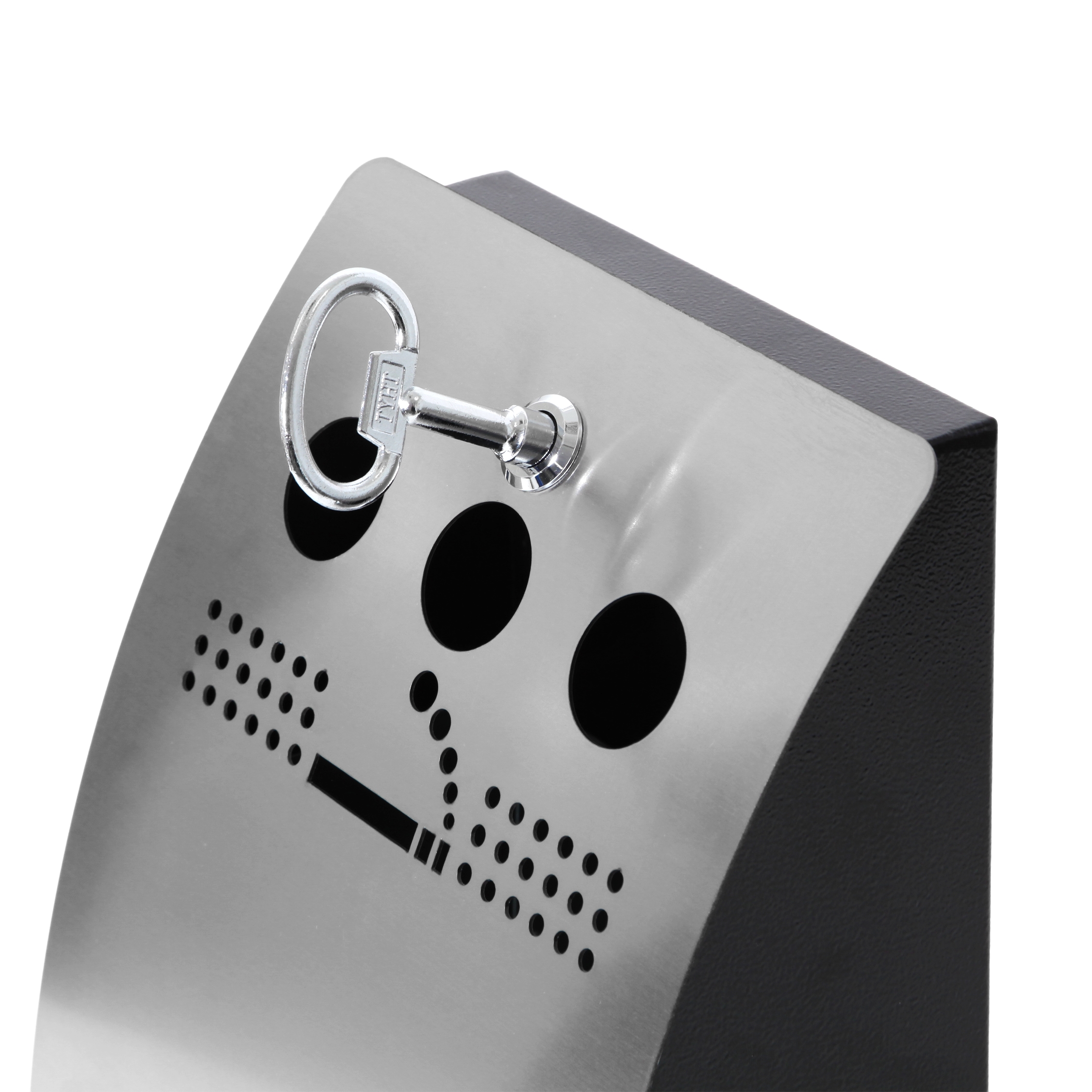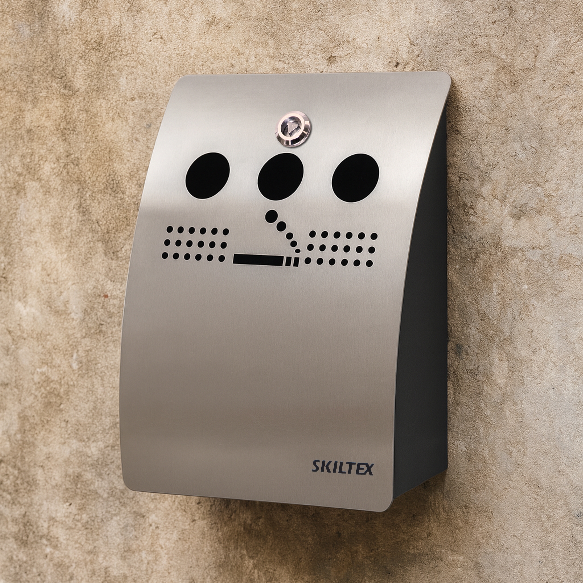 Et robust og stilrent utendørs askebeger for veggmontering. Den buede sorte stålkonstruksjonen kombinert med en børstet rustfri stålfront gir askebegeret et eksklusivt uttrykk og svært god holdbarhet. Fronten har tre hull med grill som gjør det enkelt og trygt å kaste sigarettsneiper. Askebegeret er utstyrt med en låsbar front og en galvanisert innerbeholder som sikrer hygienisk og driftssikker bruk over tid.