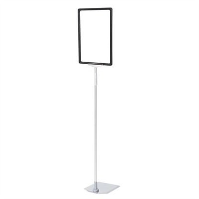 Skiltholder av topp kvalitet med en flott, tung og stabil metallfot med krom overflate, justerbar sølveloksert aluminium XL teleskopstang (70 til 120 cm) og svart A4 ramme i ABS-plast.