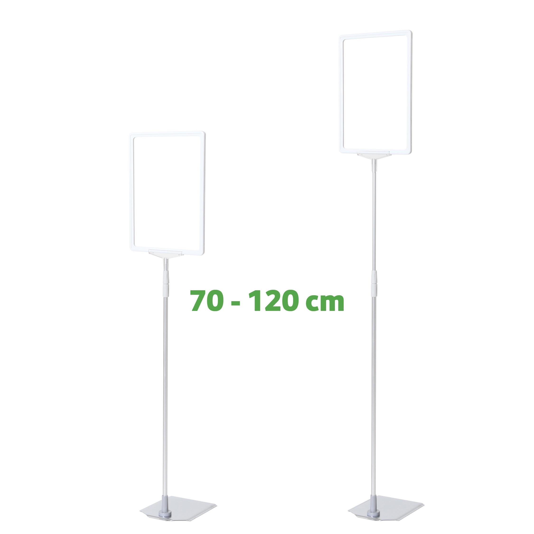 Skiltholder av topp kvalitet med en flott, tung og stabil metallfot med krom overflate, justerbar sølveloksert aluminium XL teleskopstang (70 til 120 cm) og hvit A4 ramme i ABS-plast.