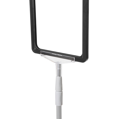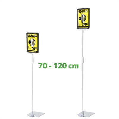 Skiltholderen er utstyrt med en ekstra lang teleskopstang som kan justeres fra 70 til 120 cm i høyden.