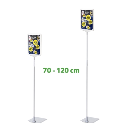 Skiltholder av topp kvalitet med en flott, tung og stabil metallfot med krom overflate, justerbar sølveloksert aluminium XL teleskopstang (70 til 120 cm) og hvit A5 ramme i ABS-plast.