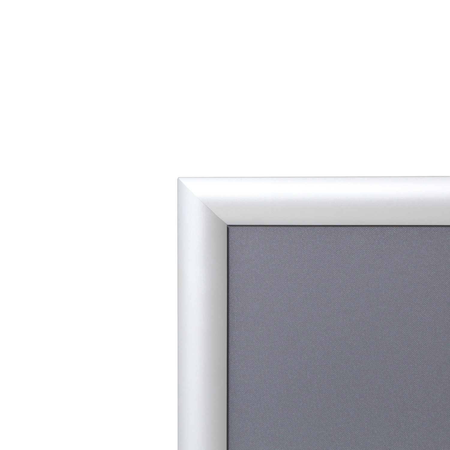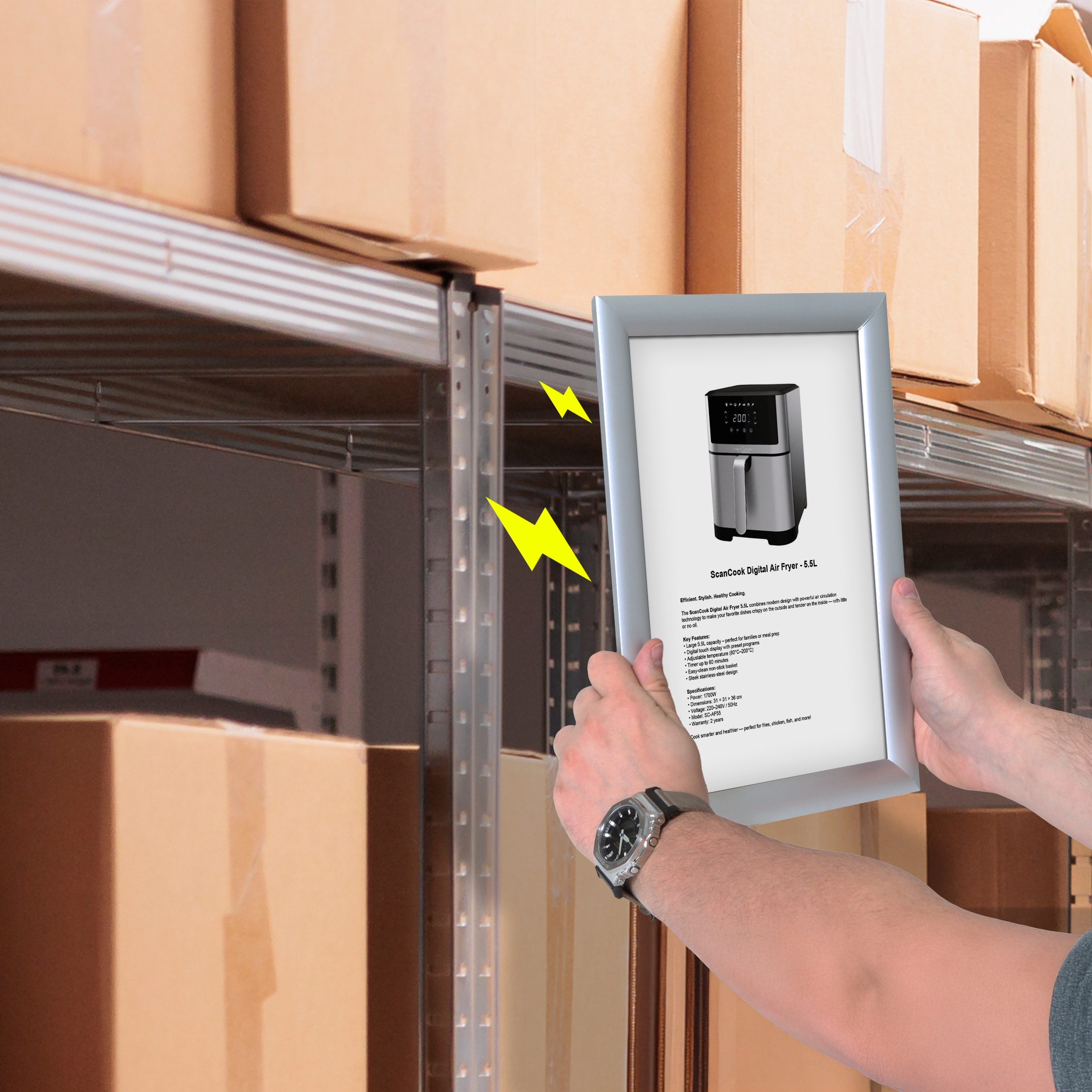Frontprofilen er laget av sølveloksert aluminium med avrundet form som gir et elegant og profesjonelt uttrykk. Klikkfunksjonen gjør det enkelt å åpne rammen og bytte innhold på sekunder. Magnetbåndet sørger for stabil og fleksibel montering på alle magnetiske flater – perfekt til lagerhyller, dører, tavler og maskiner.