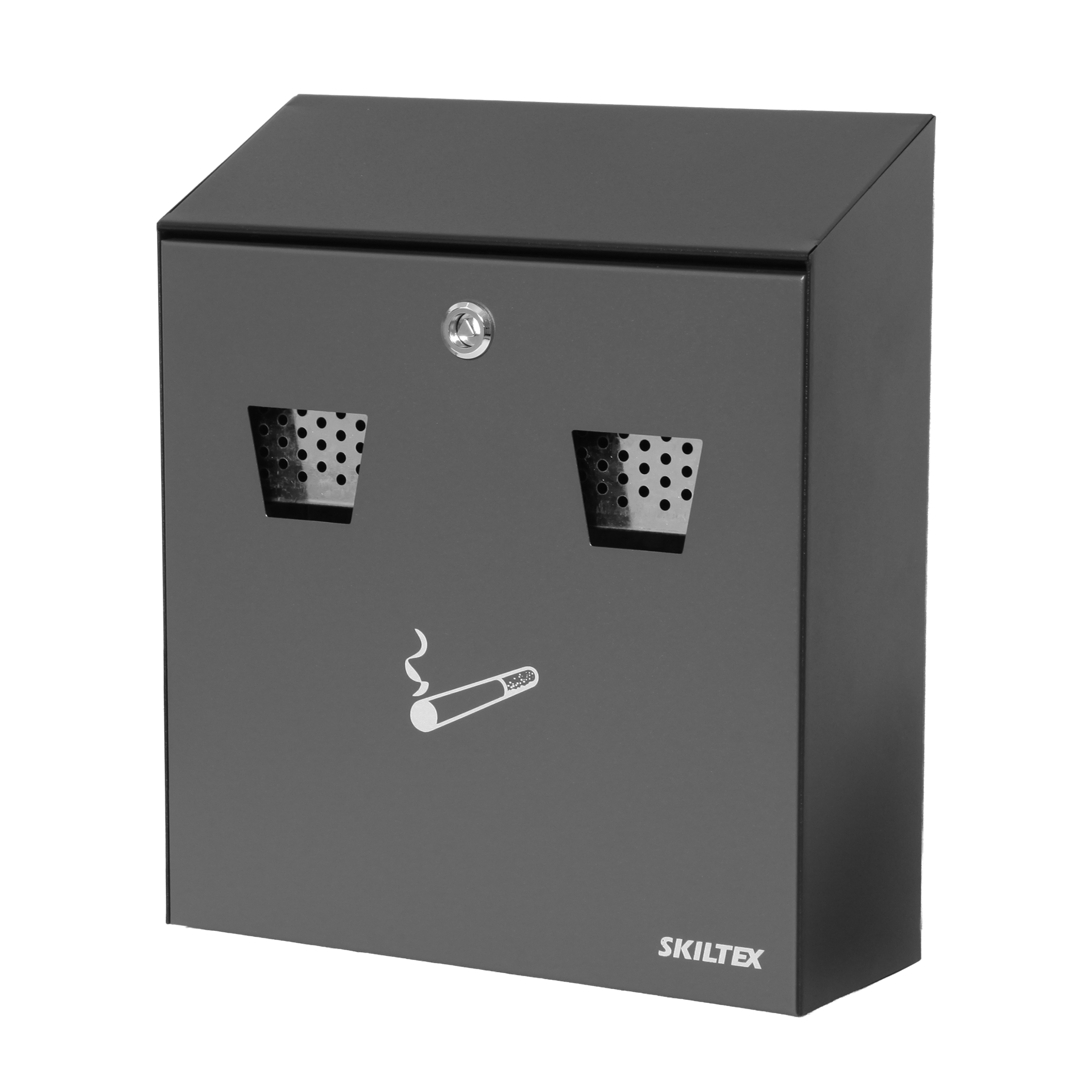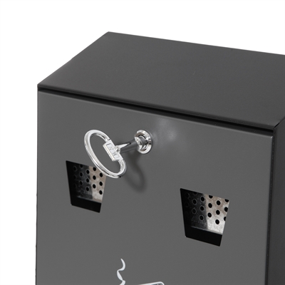Fronten kan låses, har en liten sigarett symbol på og er utstyrt med 2 huller med nett for enkel tømming av sigarettsneiper.