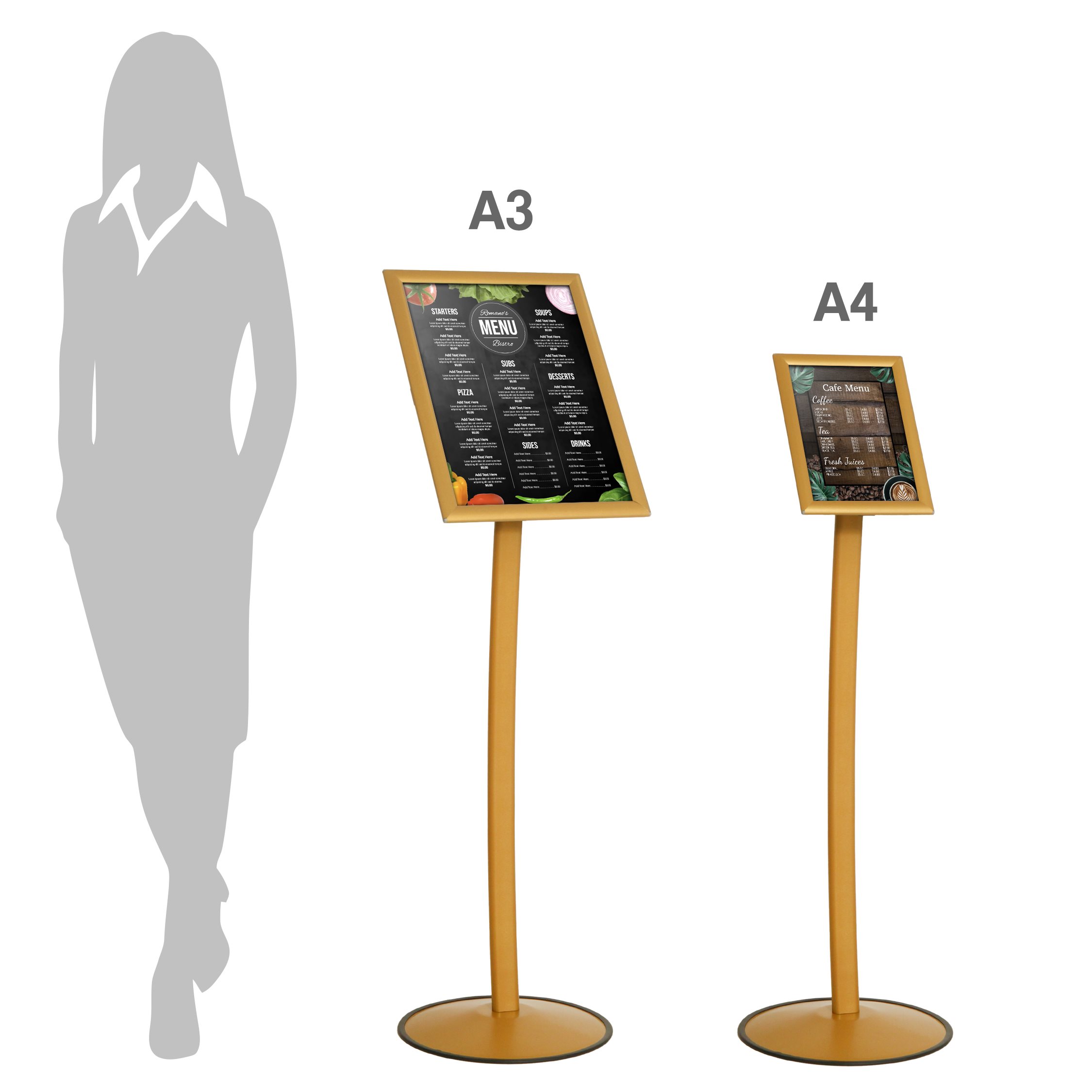 MenuPro Frittstående Gullfarget Buet Infostativ – Elegant og stilren plakatstativ for A4 og A3 Plakater