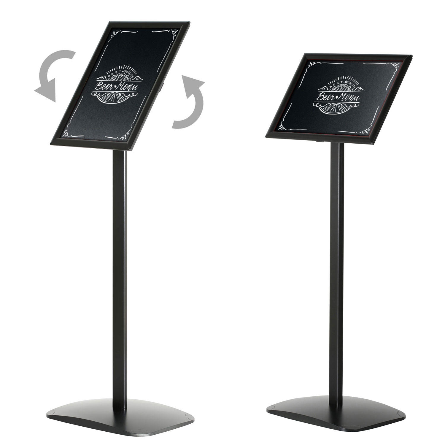 Sort infostativ / menystativ montert med 25 mm profil eloksert aluminium klikkramme og skrivbar sort kridttavleplate. Rammen kan justeres – kan brukes i både stående og liggende format (vertikal og horisontal). Kridttavleplaten kan skrives på med kridttavlepenner og kan rengjøres og byttes ut enkelt. En alternativ skilteløsning for restauranter, skoler, hoteller, museer, biblioteker, detaljhandel m.m.