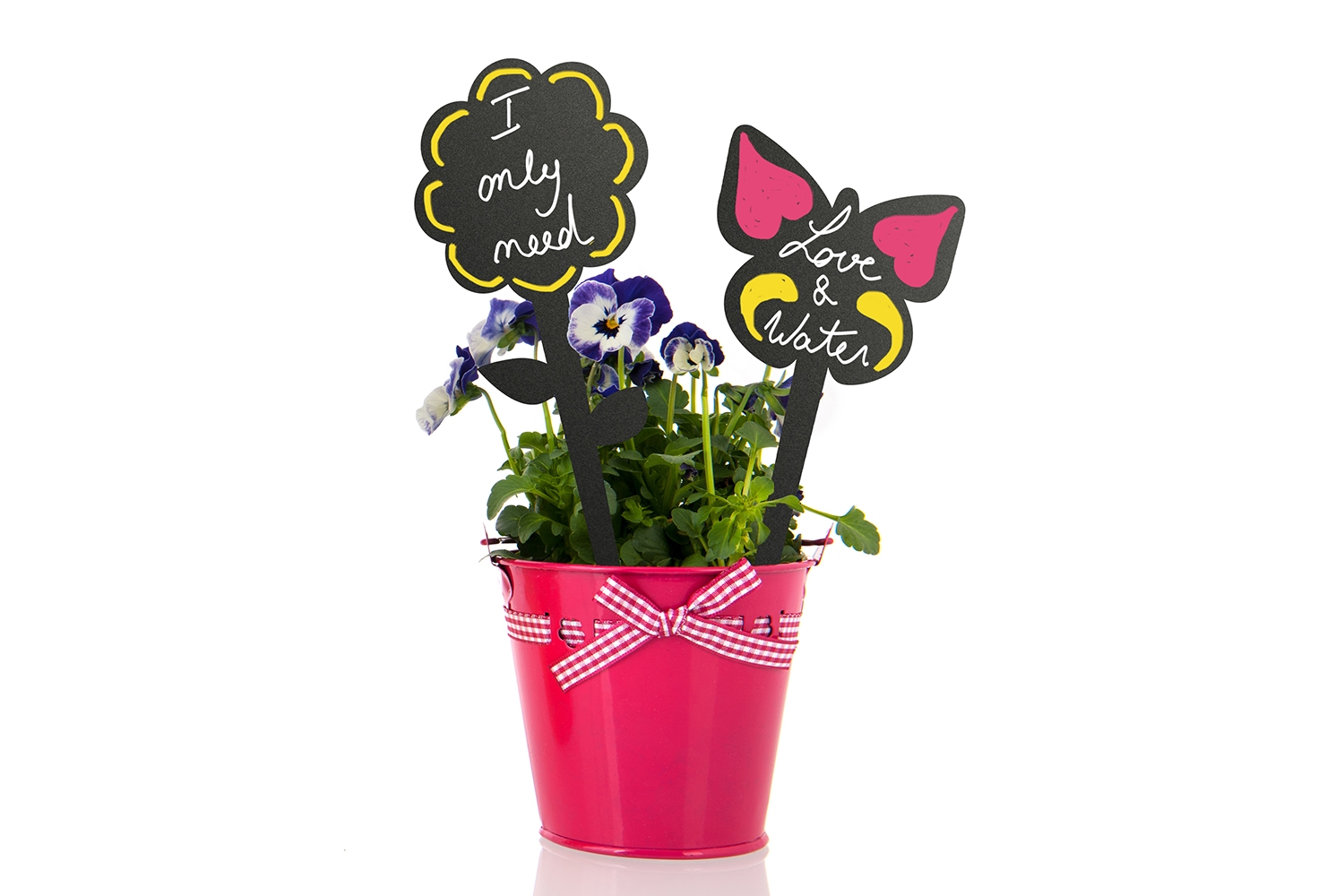 Gi dine produkter en estetisk presentasjon, med disse fine små kritt-tavler spydskilter, i blomst silhuett design og dobbelsidedige skriveoverflater. Pakken inneholder 5 stykk spydskilt, som kan stikkes ned i alle myke overflater. Det følger også en hvit 1-2mm krittmarker penn med.