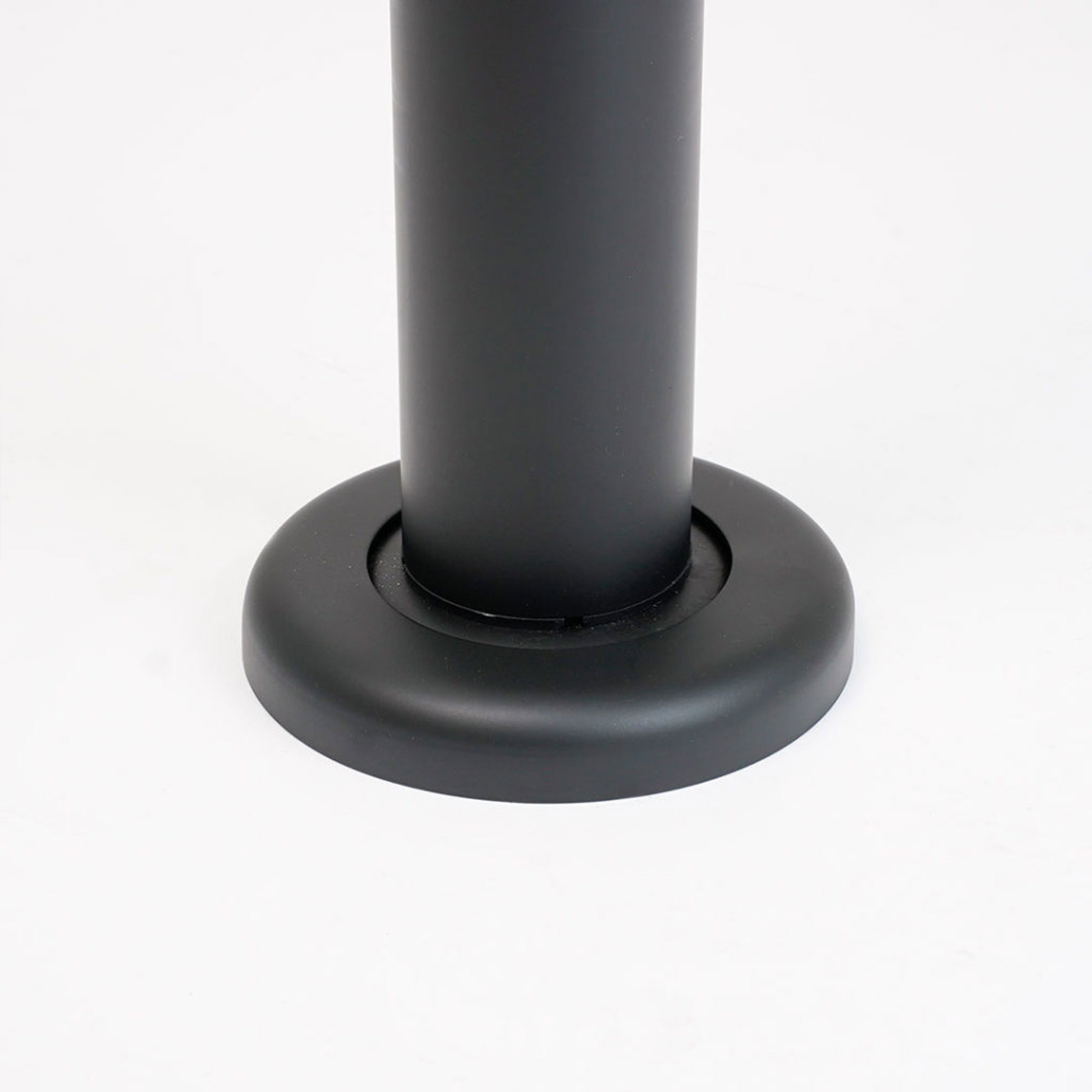 Profesjonell svart avspærringsstolpe, laget av galvanisert stål med integrert, boltmonterbar fot - designet for fast montering på gulvet. En dekkeplate for foten følger med – som gir et pent og ferdig utseende etter montering.
