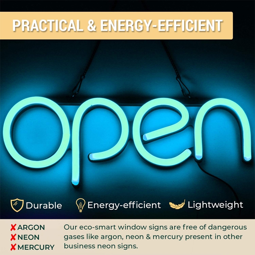 Tiltrekk flere kunder og se din virksomhet vokse med våres OPEN LED Neonskilt. Skap oppmerksomhet og vis alle rundt dere at dere er åpne for business! Våres skarpe og iøyefallende isblå LED skilt vil bringe flere kunder gjennom deres dør. Fargerikt og skinnende LED lys.