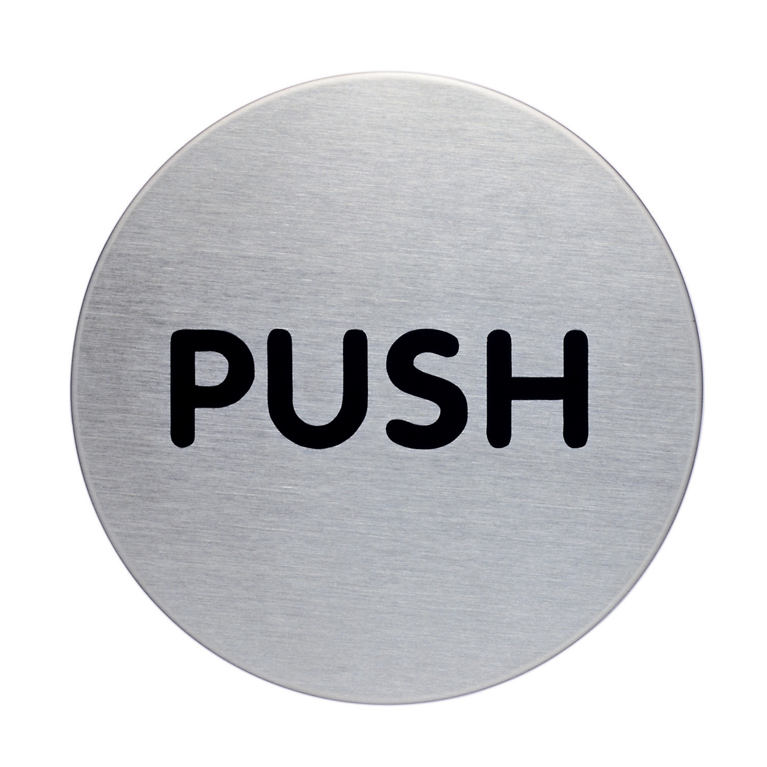 Rundt skilt i børstet rustfritt stål med teksten PUSH.