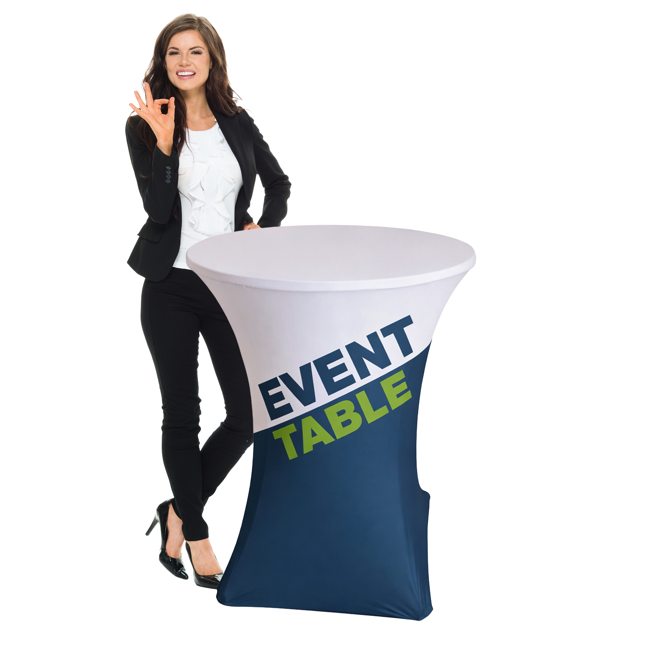 Rundt ståbord/klappbord med eget print – praktisk, elegant og allsidig – perfekt til messer, events og fester!