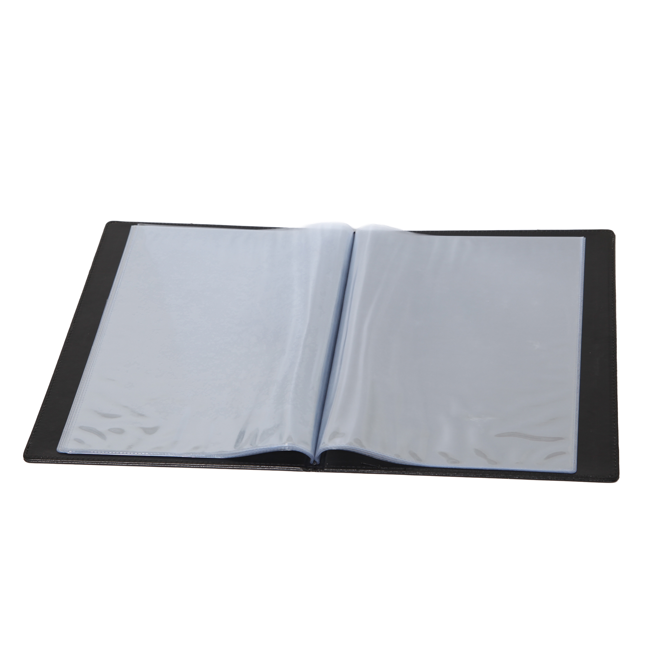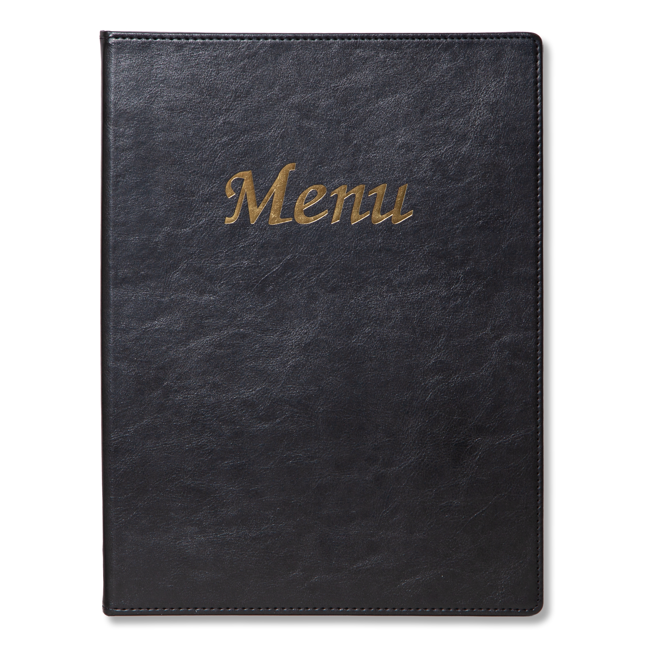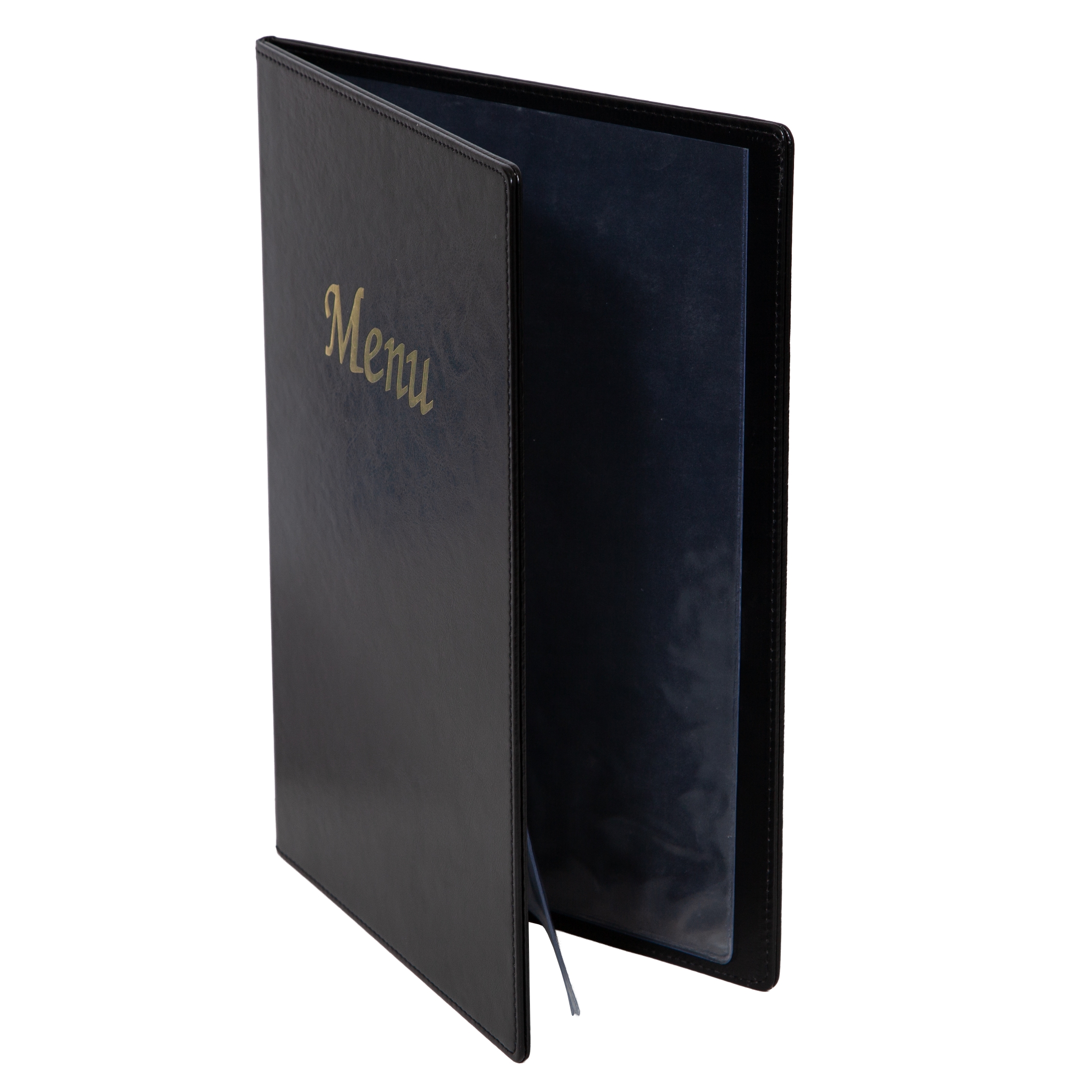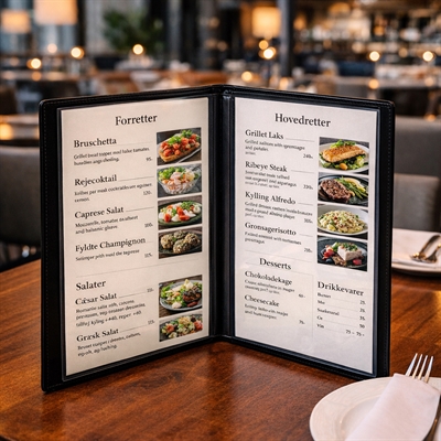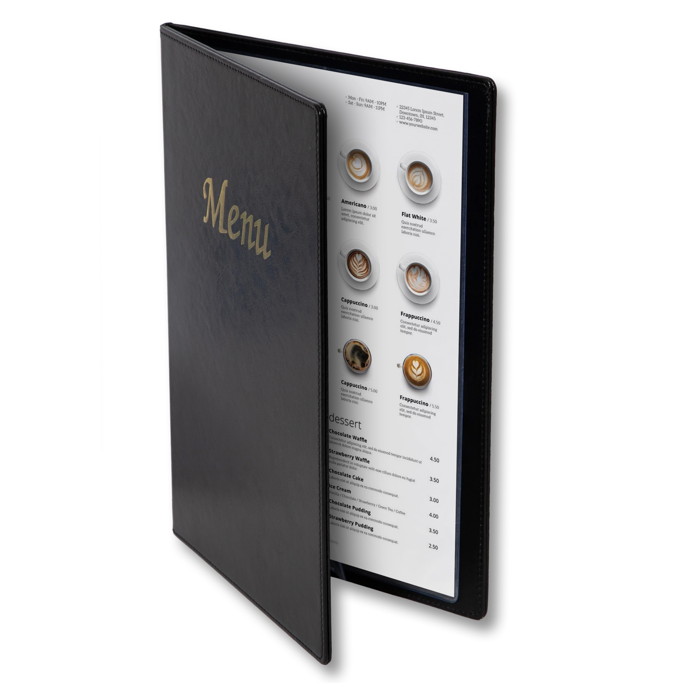 Denne elegante menymappen i svart skinnlook er et opplagt valg for restauranter, kafeer og hoteller som ønsker å presentere menyene sine med stil. Den har et klassisk «Menu»-trykk på forsiden og leveres med 10 antireflekslommer for A4-sider, som gir plass til opptil 20 sider totalt – 2 sider per lomme.