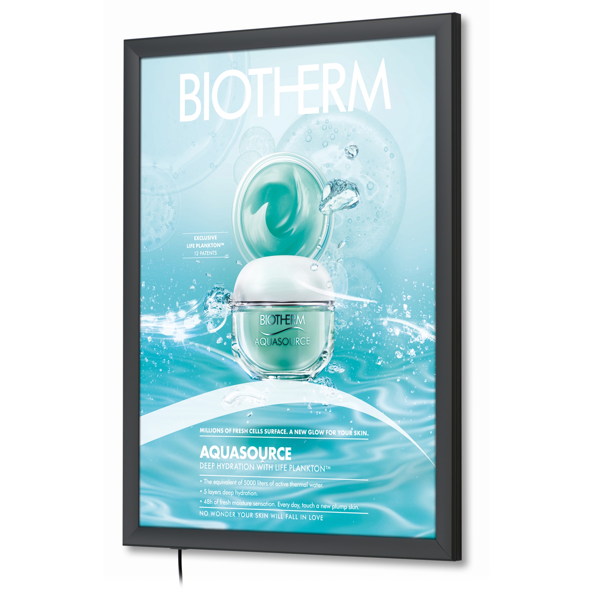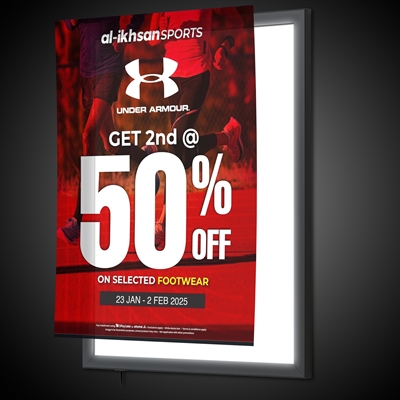 Disse rammene er laget med en stilig 35mm sort aluminiumsprofil og lyser opp plakatene med kraftig LED-lys på en pen og jevn måte.