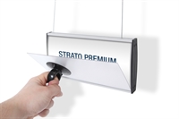 Dobbelsidig nedhengsskilt med avtagelige anti-refleks frontplater, til takmontering med wire og beslag.