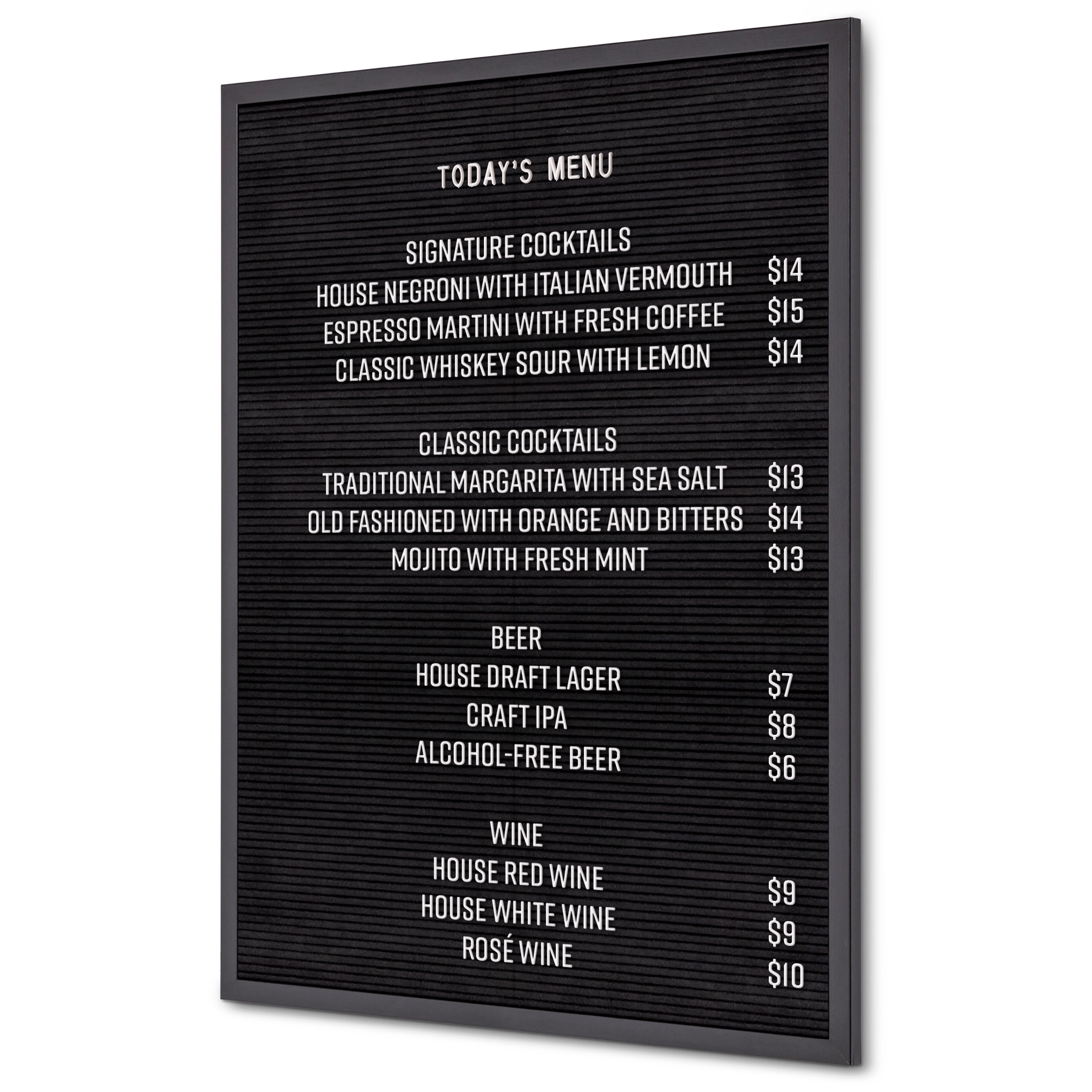 En perfekt tavle for korte beskjeder på bar, kafé, kontoret eller til og med hjemme. Legg for eksempel til menyen din, en hilsen, melding eller sitat.