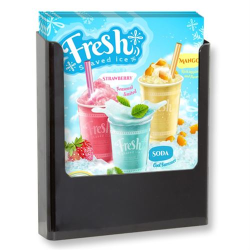 Stilrent svart brosjyreholder produsert i polystyren til montering på vegg.