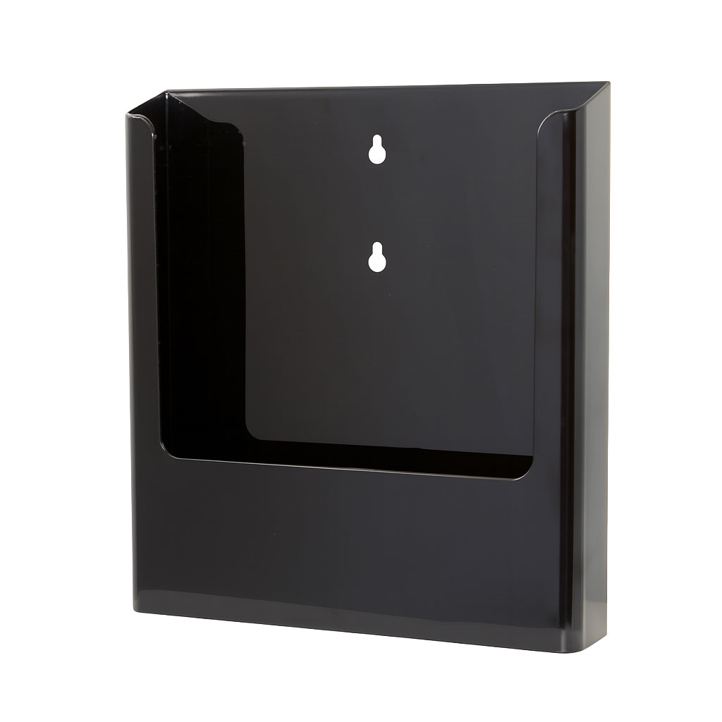Stilrent svart brosjyreholder produsert i polystyren til montering på vegg.