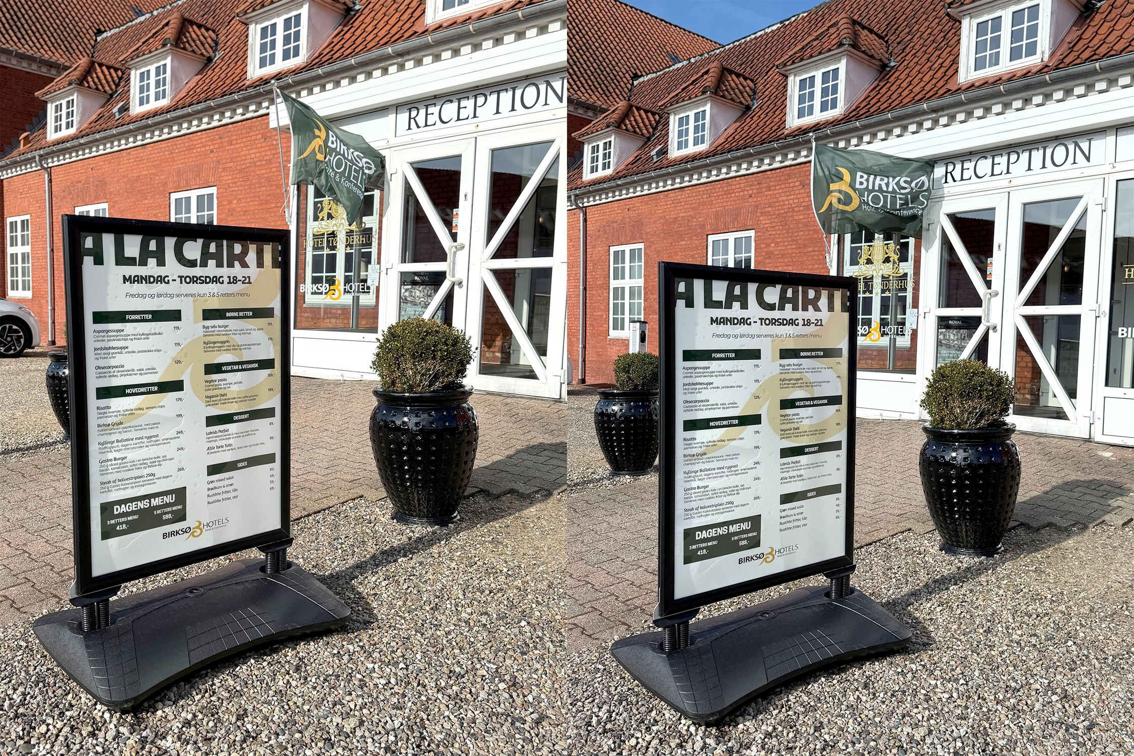 Skiltet er ideelt for utendørs bruk og har en solid base i slagfast plast. Basen kan fylles med vann eller sand for høy stabilitet – også i vind. Husk frostvæske ved bruk av vann om vinteren.
