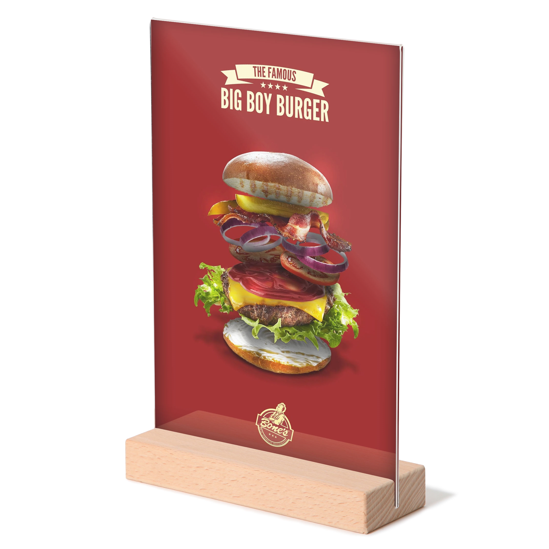 Dette elegante T-stand med trebunn er den perfekte løsningen for å presentere menyer, tilbud eller annonser i et stilfullt format. Den holdbare bøketrefot sikrer både funksjonalitet og estetikk, noe som gjør den ideell for profesjonelle miljøer som kafeer, restauranter, hoteller og kantiner.