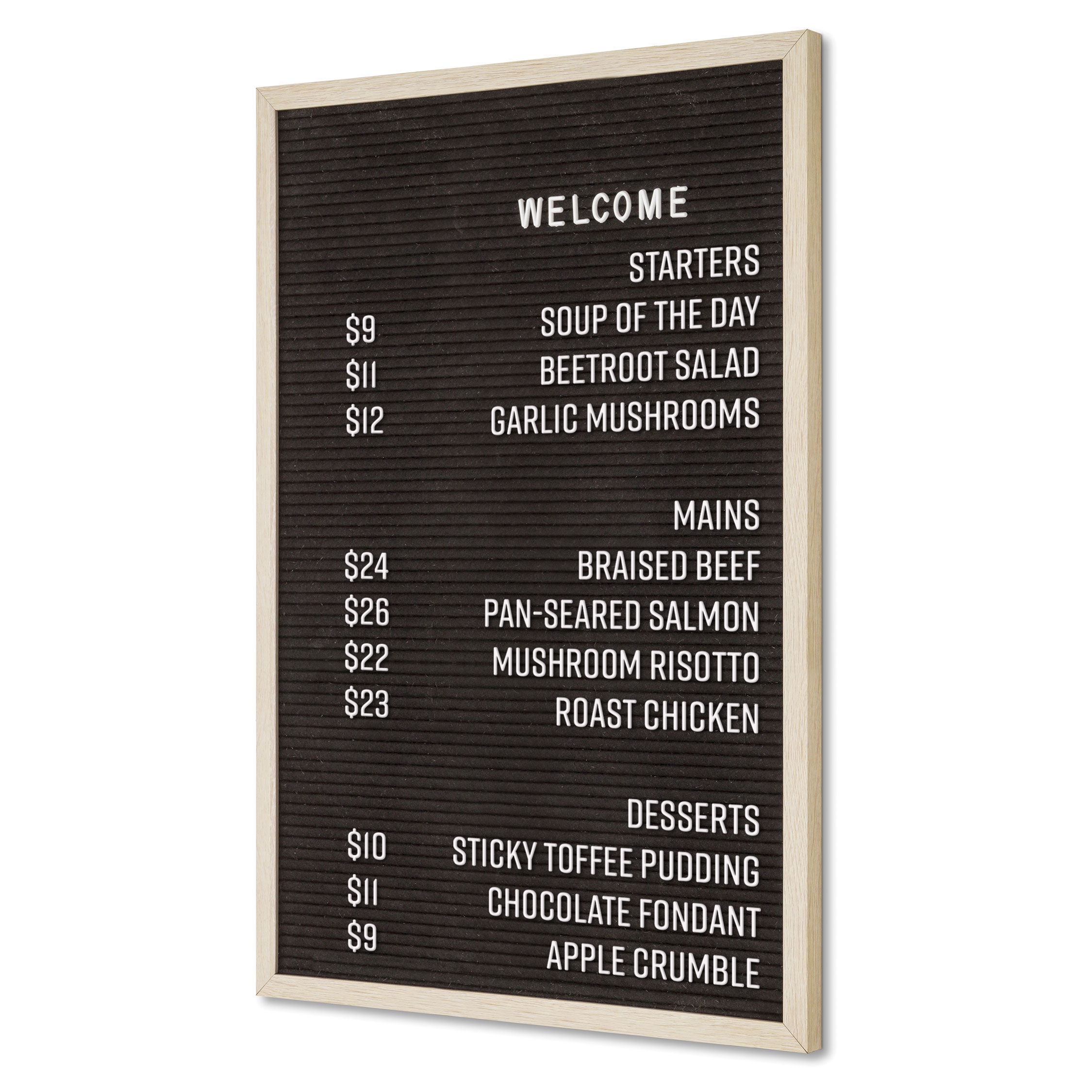 Klassisk Letter Board i stilrent design med sort filt og ramme i lyst teaktre. Skap synlig og elegant kommunikasjon med et moderne vintage-uttrykk!