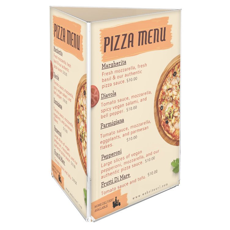 Vertikal tresidig menykortholder produsert i 2 mm akryl av høy kvalitet som gir et krystallklart og profesjonelt utseende. De tre sidene gjør den ideell til visning av menyer og prislister på bord i restauranter og kafeer.
