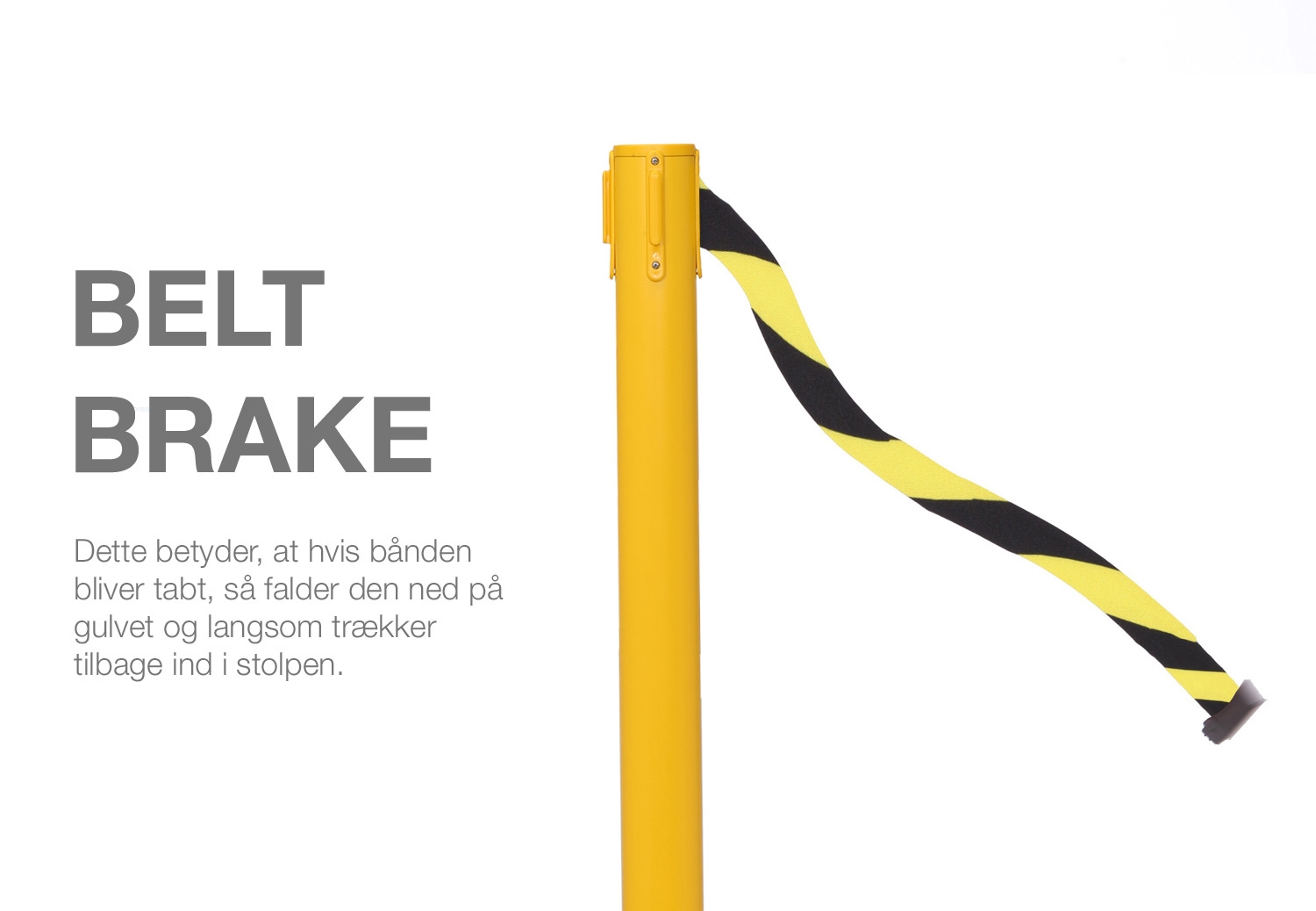 Disse kø-ledere har et avansert sikkerhetsbremsesystem – Dette betyr at hvis båndet blir tapt så faller det ned på gulvet og trekker seg langsomt tilbake inn i spolen.